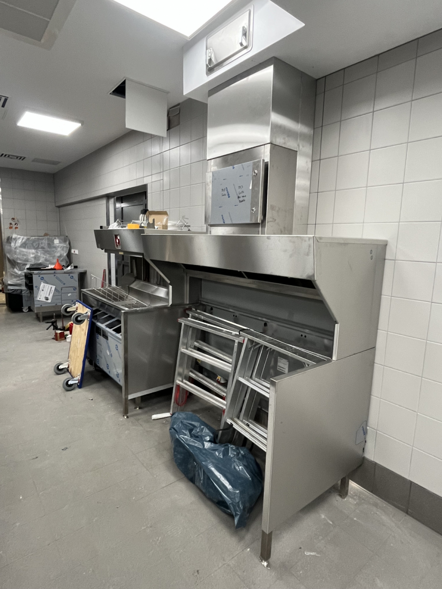 Küchenumbau der Cafeteria durch Betreiber Wechsel. Kühl- und Tiefkühlschränke, Rational Kombidämpfer CM Plus mit Kondensathaube, Sonderanfertigung der kompletten Sockelverkleidung in Edelstahl wurden geliefert und montiert.